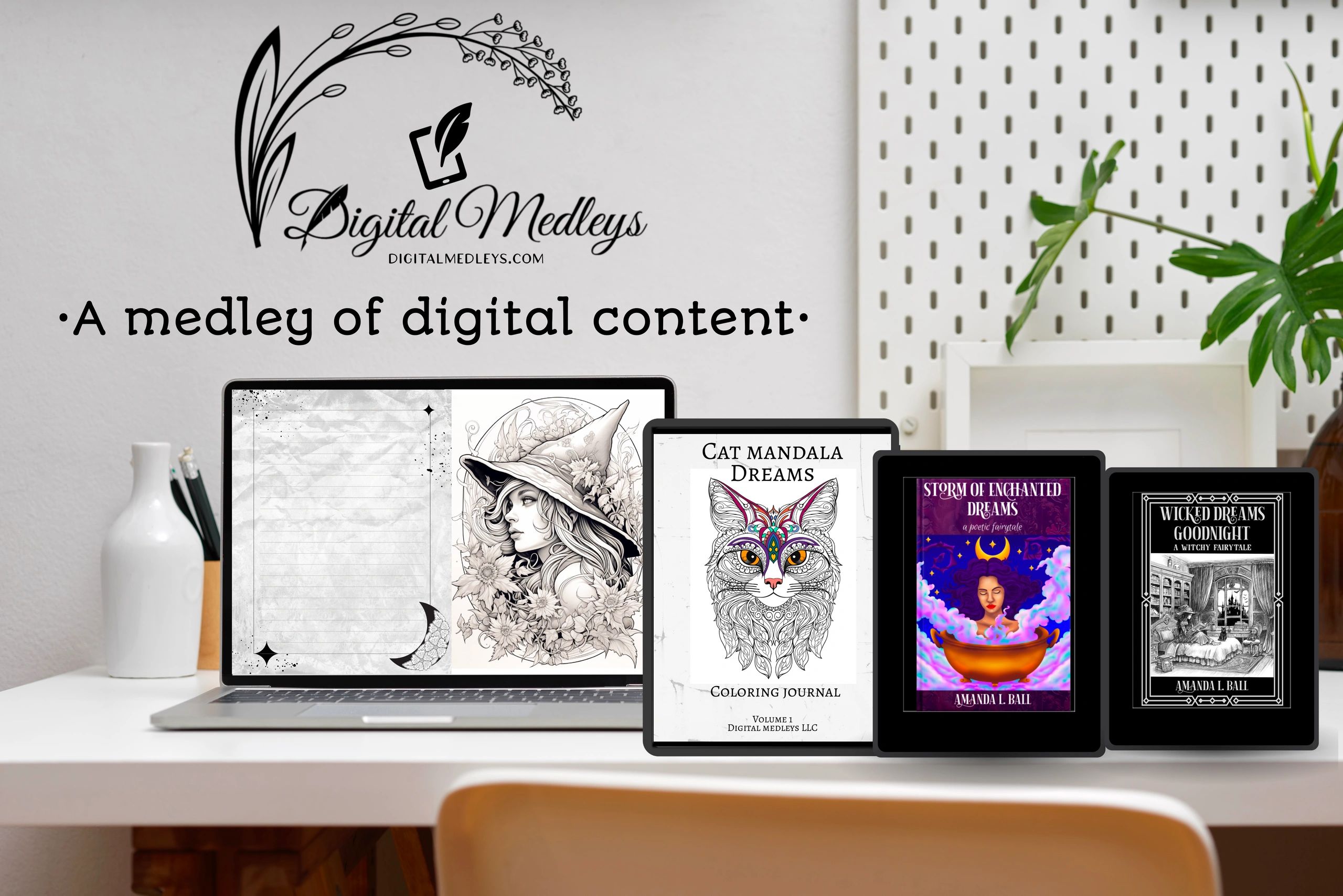 Digital Medleys LLC is the brand and publisher offering a medley of digitally designed products, including coloring journals, planners, and notebooks.